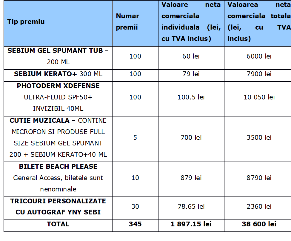 6.3. Pentru premiile CUTIA MUZICALA CU MICROFON SI PRODUSE SEBIUM, dar si prentru BILETELE BEACH PLEASE ACCES GENERAL, este necesar ca cei care castiga sa fie de acord cu prelucrarea datelor personale (sa arate cartea de identitate promoteritei aflate la stand, sa completeze cu datele personale, nume, prenume, numar de telefon, CNP) in vederea acordarii premiului.