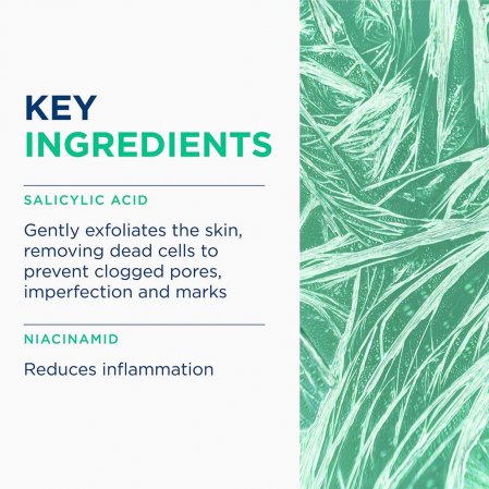 Niacinamida reduce inflamația și calmează leziunile acneice³. De asemenea, acționează ca seboreglator și inhibitor al transferului de melanozomi, responsabili de pigmentare și formarea petelor.