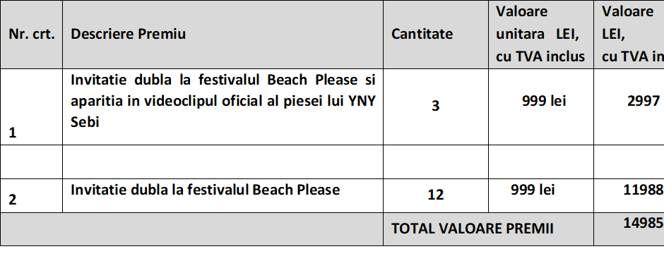 8.3. Mai intai vor fi validati castigatorii premiilor constand in invitatiile duble la festivalul Beach Please si aparitia in videoclipul oficial al piesei lui YNY Sebi, urmand apoi sa fie validati castigatorii premiilor constand in invitatii duble la festivalul Beach Please.
